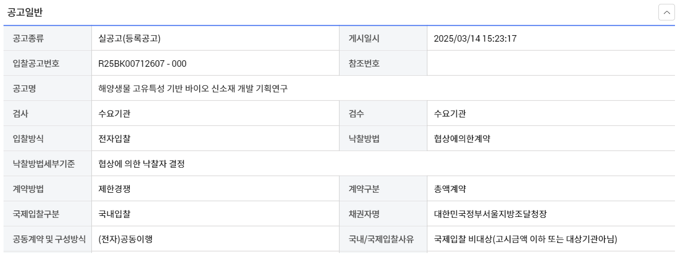 나라장터 공고 "해양생물 고유특성 기반 바이오 신소재 개발 기획연구"