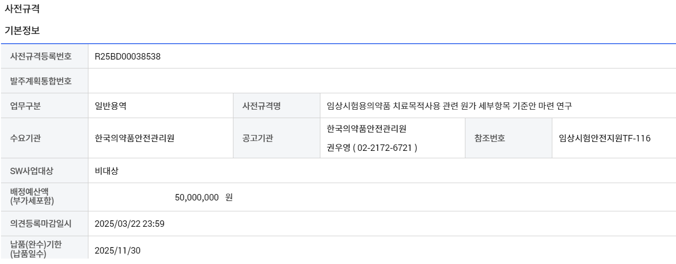 이상으로 의약품안전관리원이 지난 주 "임상시험용의약품 치료목적사용 관련 원가 세부항목 기준안 마련 연구"를 긴급공고한다는 내용의 사전규격을 올렸다는 소식 전합니다.