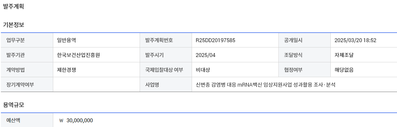 이 과업은 ‘신변종 감염병 대응 mRNA 백신 임상지원사업’의 종료를 앞두고 그 성과를 종합적으로 조사·분석하고, 향후 성과관리 및 활용계획을 수립하는 것을 목적으로 한다. 사업은 2025년 3월 기준으로 6개월간, 총 **3천만 원(VAT 포함)**의 예산으로 수행되며, 계약방식은 제한경쟁입찰에 의한 협상계약이다.